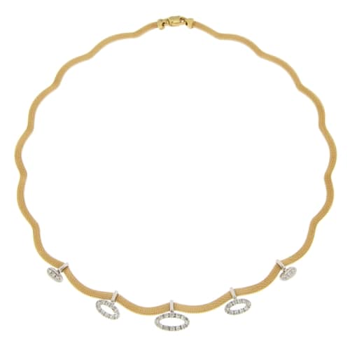 Collana Donna Oro Bianco Giallo GL100861 Collana da donna in oro bianco e giallo 750/00 (18 kt). La maglia della collana è semirigida tipo filigrana. Elementi pendenti con pietre zirconi bianchi. La lunghezza della collana è di 42 cm. La larghezza massima della collana è di 0.40 cm. Il peso della collana è di 21.40 grammi. Referenza: GL100861