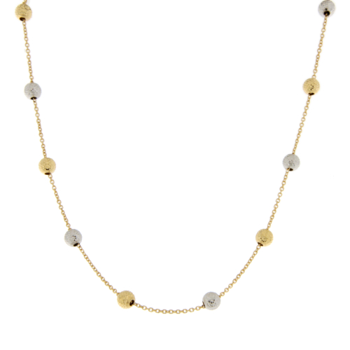 Collana Donna Oro Bianco Giallo GL102067 Collana da donna in oro bianco e giallo 750 (18 kt). Collana a catena con sfere diamantate, diametro 0,40 cm. La lunghezza della collana è regolabile da 45 a 48 cm, chiusura con moschettone. Il peso della collana è di 2,90 grammi. Referenza: GL102067 Questa splendida collana in oro bianco e giallo 18 KT, è l’emblema dell’eleganza contemporanea. Un intreccio di luci e riflessi che dona carattere a ogni outfit, perfetta da indossare da sola o da abbinare ad altri gioielli per un effetto unico. Ideale per chi ama distinguersi con classe e raffinatezza.