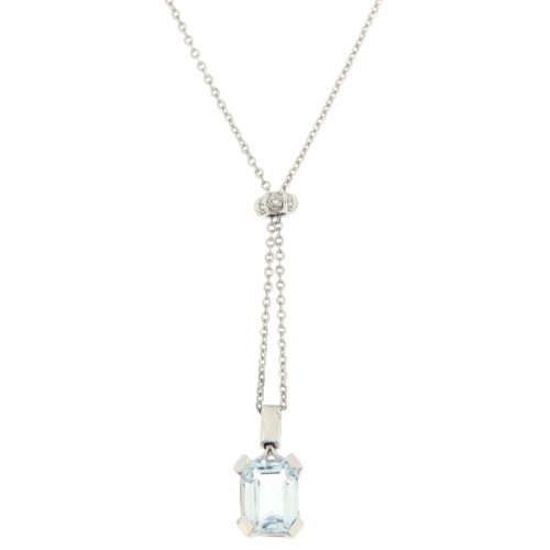 Collana Donna Oro Bianco GL100246 Collana da donna in oro bianco 750/00 (18 kt) con acquamarina e diamanti. La maglia della collana è a catena modello rolo’. La collana ha un pendente di lunghezza 4,50 cm con acquamarina taglio baguette e diamanti di carati totali 0,03. La lunghezza della collana è di 45 cm. Referenza: GL100246