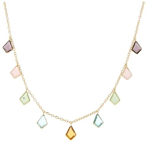 Collana Donna Oro Giallo GL100704 Collana da donna in oro giallo 750/00 (18 kt). La maglia della collana è a catena con pietre zirconi multicolore pendenti. La lunghezza della collana è di 45 cm. La chiusura della collana è con moschettone. Il peso della collana è di 2.70 grammi. Referenza: GL100704