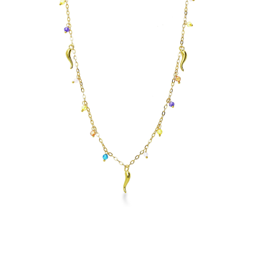 Collana Donna Oro Giallo GL101949 Collana da donna in oro giallo 750/00 (18 kt). Collana con pendenti a forma di corno portafortuna e perline colorate. La lunghezza della collana è di 42 cm. La chiusura della collana è con moschettone. Il peso della collana è di 2,30 grammi. Referenza: GL101949 Porta con te un simbolo di fortuna e stile con questa collana in oro giallo 750 (18 KT). I pendenti a forma di corno portafortuna e le perline colorate aggiungono un tocco vivace e unico al tuo look.