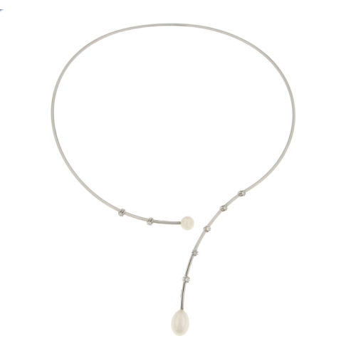 Collana Donna Yukiko CL943 Collana da donna Yukiko realizzata in oro bianco 750/00 (18 KT). Collana semirigida con 7 diamanti naturali, colore H, caratura totale 0.21 ct; 2 Perle coltivate colore bianco, diametro 6.5/7 – 8/8.5. Referenza: CL943 Articolo spedito con garanzia ed astuccio originale Yukiko