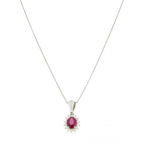 Collana Promesse Gioielli Donna Rubino Diamanti CCPQ54R Collana da donna Promesse Gioielli in oro bianco 750/00 con diamanti e rubini. La collana ha un ciondolo di dimensioni 1,50 x 0,80 cm con 14 diamanti di caratura totale 0,11 carati ed un rubino di 0,40 carati. La lunghezza della collana è di 45 cm. Referenza: CCPQ54R I gioielli Promesse, sono caratterizzati da uno stile unico, espressione pregiata del Made in Italy; gioielli dal carattere elegante, cui il valore è eterno. Collana spedita con astuccio originale e garanzia ufficiale Promesse gioielli