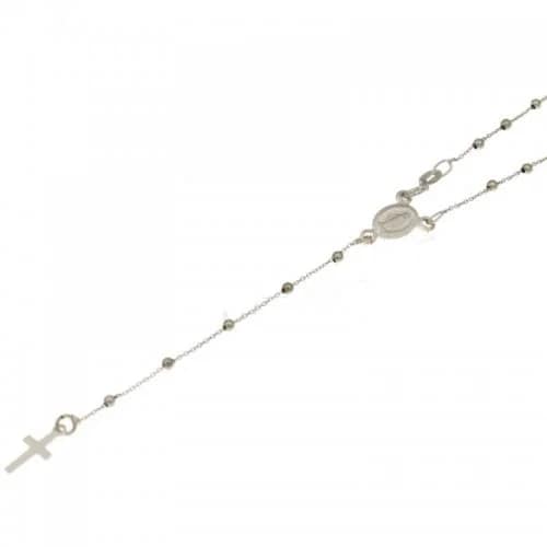 Collana rosario in oro bianco 750/00 con grani lucidi, collana maglia rolò 45 cm, dimensione grani mm 2, lunghezza pendente cm 7,5, dimensione croce mm 6 x 11. Peso 2,7 grammi. La collana sarà spedito nella confezione della nostra gioielleria, con certificato di autenticità. Non è quello che cercavi? Scopri tutta la collezione di gioielli rosario