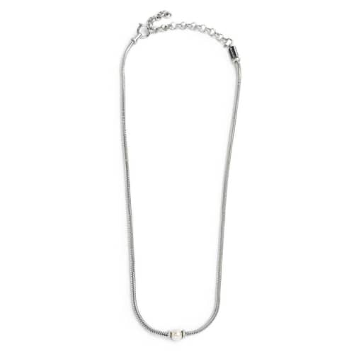 Collana Unisex Marlù 13CO0153-W Collana in acciaio con catena snake e con al centro sfera, anelli con texture all’estremità. Ad una estremità elemento triangolare in acciaio con trama in black oil, logo Marlù e la parola Namastè collegato ad estensione con catena rolò con trama, removibile e/o regolabile tramite moschettoni tondi. All’altra estremità chiusura con moschettone tondo. Lunghezza totale 60 cm, regolabile da 60 a 50 cm. Referenza: 13CO0153-W Articolo spedito con garanzia e astuccio Marlù