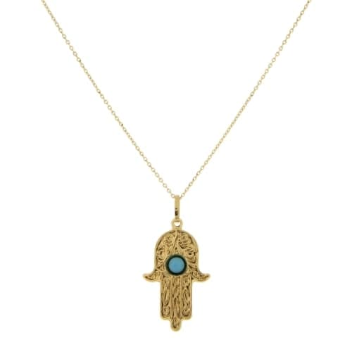 Collana Unisex Oro Giallo GL101207 Collana unisex in oro giallo 750/00 (18 kt). Collana a catena modello rolo’ con pendente a forma di mano di Fatima con pietra turchese. La lunghezza della collana è di 45 cm. Il peso della collana è di 2.10 grammi. Referenza: GL101207