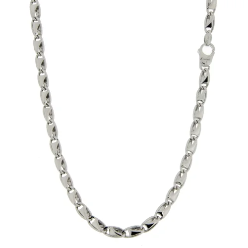 Collana Uomo Oro Bianco GL101078 Collana da uomo in oro bianco 750/00 (18 kt). La maglia della collana è a catena con riportini. La lunghezza della collana è di 50 cm. La larghezza della maglia è di 0.35 cm. La chiusura della collana è con moschettone. Il peso della collana è di 7.30 grammi. Referenza: GL101078