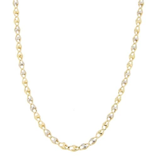 Collana Uomo Oro Giallo Bianco GL100331 Collana da uomo in oro giallo e bianco 750/00 (18 kt). La maglia della collana è a catena modello con riportini con lavorazione lucida e rigata. La lunghezza della collana è di 50 cm. La larghezza della maglia è di 0,40 cm. La chiusura della collana è con moschettone. Il peso della collana è di 5,10 grammi. Referenza: GL100331