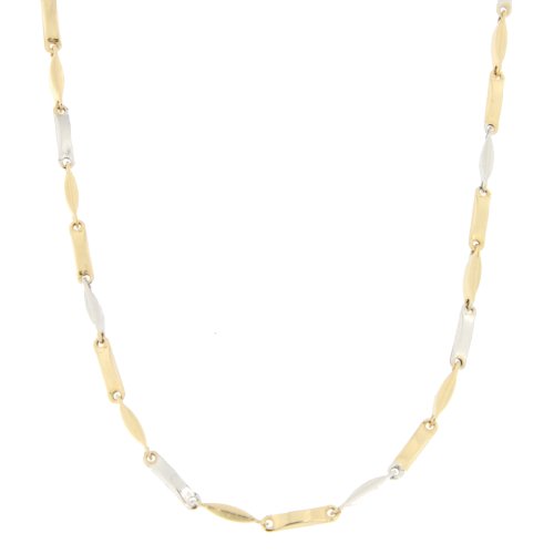 Collana Uomo Oro Giallo Bianco GL10035 Collana da uomo in oro giallo e bianco 750/00 (18 kt). La maglia della collana è a catena modello tubolare con lavorazione lucida. La lunghezza della collana è di 50 cm. La larghezza della maglia è di 0,30 cm. La chiusura della collana è con moschettone. Il peso della collana è di 8,80 grammi. Referenza: GL100353