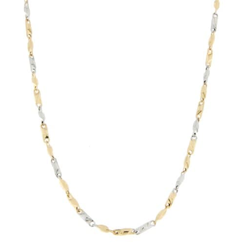 Collana Uomo Oro Giallo Bianco GL100356 Collana da uomo in oro giallo e bianco 750/00 (18 kt). La maglia della collana è a catena modello tubolare con lavorazione lucida. La lunghezza della collana è di 50 cm. La larghezza della maglia è di 0,30 cm. La chiusura della collana è con moschettone. Il peso della collana è di 7,10 grammi. Referenza: GL100356