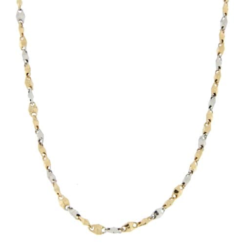 Collana Uomo Oro Giallo Bianco GL100360 Collana da uomo in oro giallo e bianco 750/00 (18 kt). La maglia della collana è a catena modello tubolare con lavorazione lucida. La lunghezza della collana è di 50 cm. La larghezza della maglia è di 0,40 cm. La chiusura della collana è con moschettone. Il peso della collana è di 6,30 grammi. Referenza: GL100360