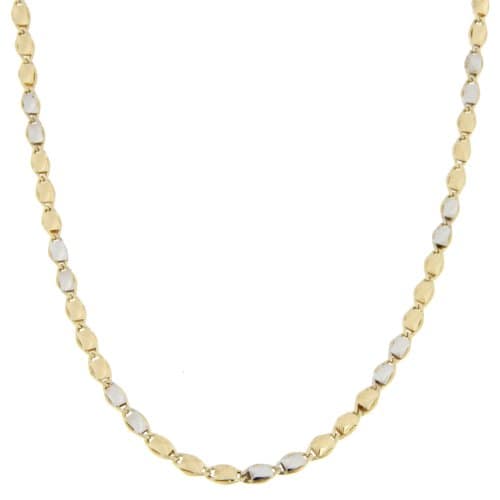 Collana Uomo Oro Giallo Bianco GL100362 Collana da uomo in oro giallo e bianco 750/00 (18 kt). La maglia della collana è a catena modello con riportini con lavorazione lucida. La lunghezza della collana è di 50 cm. La larghezza della maglia è di 0,40 cm. La chiusura della collana è con moschettone. Il peso della collana è di 6,30 grammi. Referenza: GL100362