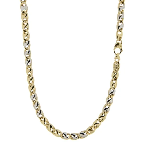 Collana Uomo Oro Giallo Bianco GL100558 Collana da uomo in oro giallo e bianco 750/00 (18 kt). La maglia della collana è a catena modello con riportini. La lunghezza della collana è di 50 cm. La larghezza della maglia è di 0.40 cm. La chiusura della collana è con moschettone. Il peso della collana è di 11.50 grammi. Referenza: GL100558