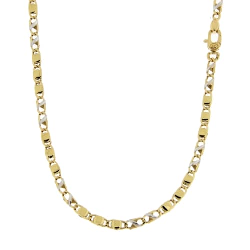 Collana Uomo Oro Giallo Bianco GL101088 Collana da uomo in oro giallo e bianco 750/00 (18 kt). La maglia della collana è a catena modello con riportini. La lunghezza della collana è di 60 cm. La larghezza della maglia è di 0.30 cm. La chiusura della collana è con moschettone. Il peso della collana è di 8.80 grammi. Referenza: GL101088