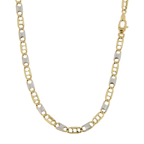 Collana Uomo Oro Giallo Bianco GL101089 Collana da uomo in oro giallo e bianco 750/00 (18 kt). La maglia della collana è a catena modello fantasia. La lunghezza della collana è di 60 cm. La larghezza della maglia è di 0.40 cm. La chiusura della collana è con moschettone. Il peso della collana è di 10.80 grammi. Referenza: GL101089