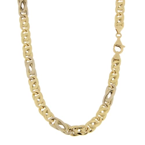 Collana Uomo Oro Giallo Bianco GL101296 Collana da uomo in oro giallo e bianco 750/00 (18 kt). La maglia della collana è a catena. La lunghezza della collana è di 50 cm. La larghezza della maglia è di 0.60 cm. La chiusura della collana è con moschettone. Il peso della collana è di 19.80 grammi. Referenza: GL101296