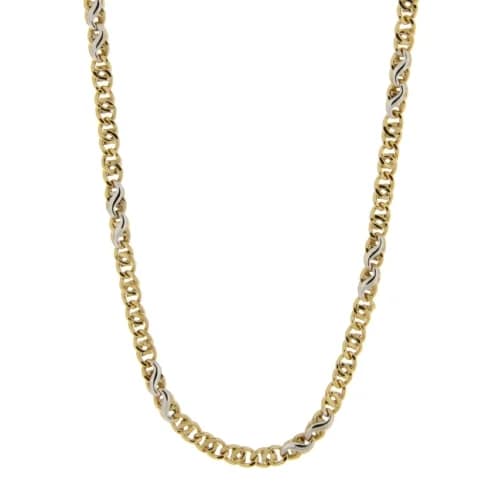 Collana Uomo Oro Giallo Bianco GL101410 Collana da uomo in oro giallo e bianco 750/00 (18 kt). La maglia della collana è a catena con riportini. La lunghezza della collana è di 50 cm. La larghezza della maglia è di 0.30 cm. La chiusura della collana è con moschettone. Il peso della collana è di 6.90 grammi. Referenza: GL101410