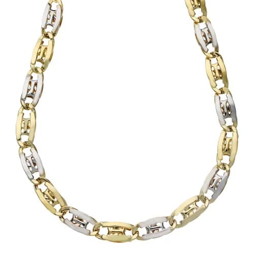 Collana Uomo Oro Giallo Bianco GL101881 Collana da uomo in oro giallo e bianco 750/00 (18 kt). La maglia della collana è a catena, larghezza 0.60 cm. La lunghezza della collana è di 60 cm. La chiusura della collana è con moschettone. Il peso della collana è di 21.20 grammi. Referenza: GL101881 Questa elegante collana con maglia a catena è perfetta per aggiungere un tocco di stile e raffinatezza al look di ogni uomo.  Perfetta da indossare da sola o in abbinamento ad altri accessori, si distingue per il suo design classico e senza tempo. Indossala per eventi speciali o per dare un tocco elegante al tuo outfit quotidiano.