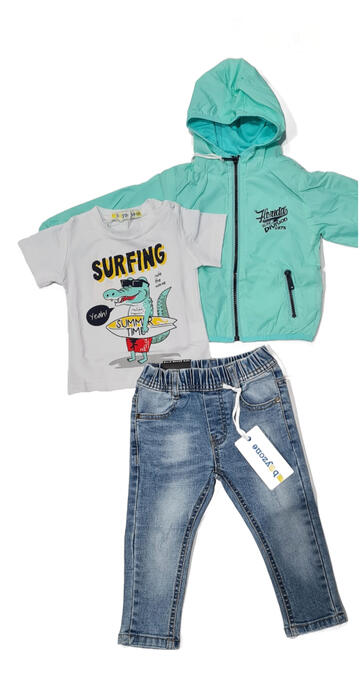 Completo da neonato Giacchetta leggera con cappuccio, chiusura a zip e stampa sulla parte frontale. Colore: azzurro Maglia a maniche corte con stampa frontale Colore: biancoPantalone in denim con elastico in vita e passanti per cintura.