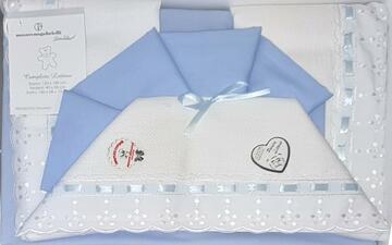 Set 3 pezzi per lettino 100% cotone Made in Italy composto da lenzuolino sopra 120×180 cm, federa 40×55 cm e lenzuolo sotto 140×68+15 cm, con pannello in tela aida da ricamare.Disponibile in taglia unica con fondo bianco e rifiniture color azzurro, bianco, giallo, rosa e verde.