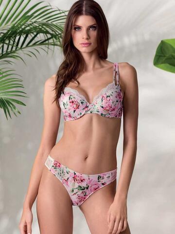 Coordinato composto da balconcino con ferretto imbottito twin-bra micro fantasia e raffinato pizzo + slip con pizzo dietro abbinato.Taglie: 2 – 3 – 4 – 5 Coppa B