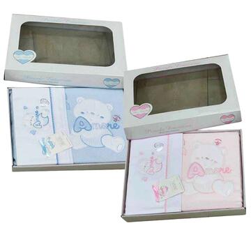 Coordinato culla 4 pezzi con copertina in cotone operato con applicazione e compelto lettino con sopra, sotto e federa.Il ricamo può variare leggermente dalla foto.