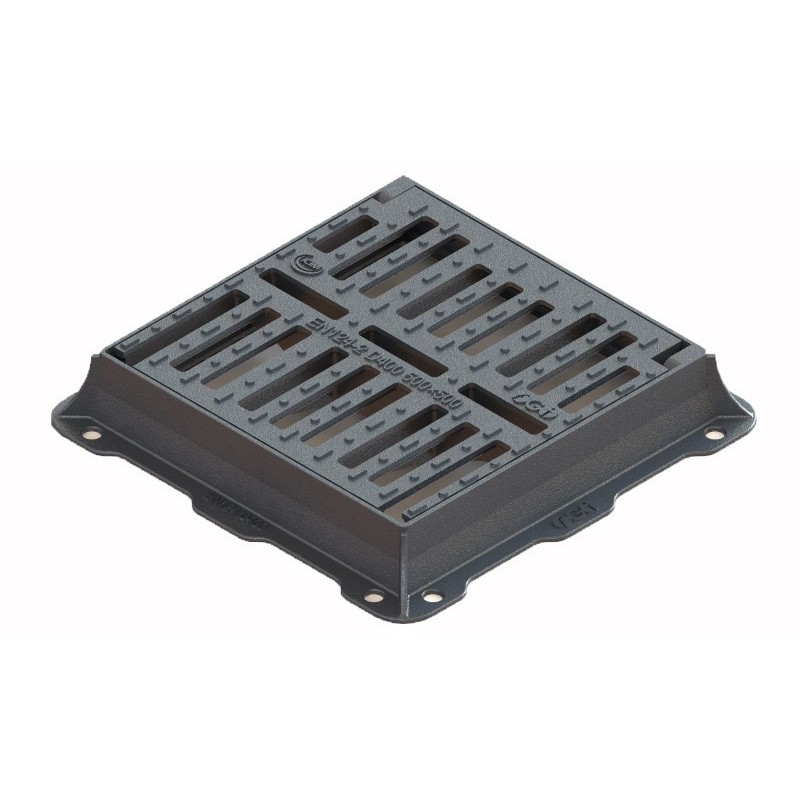 Griglia piana con telaio norma UNI EN 124.1/2 gruppo 3 classe C250 Griglia vincolata, dotata di sistema di sicurezza con chiusura a scatto. Predisposta per utilizzo sifone. Superficie drenante secondo normativa.