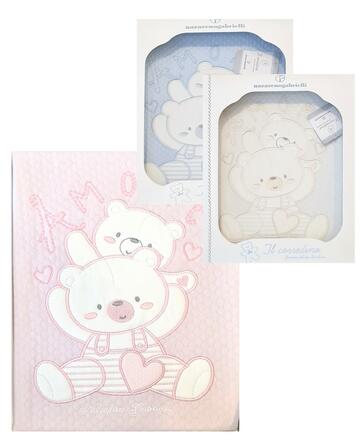 Coperta da culla in puro cotone operato con ricamo applicato.Confezionata in un’elegante scatola di cartone.Colori: Rosa, Azzurro, Bianco/blu, Bianco/Grigio, Panna/EcrùNB: Specificare nelle note dell'ordine se si hanno delle preferenze per il coloreNB: I ricami possono variare leggermente rispetto a quelli presentati in foto