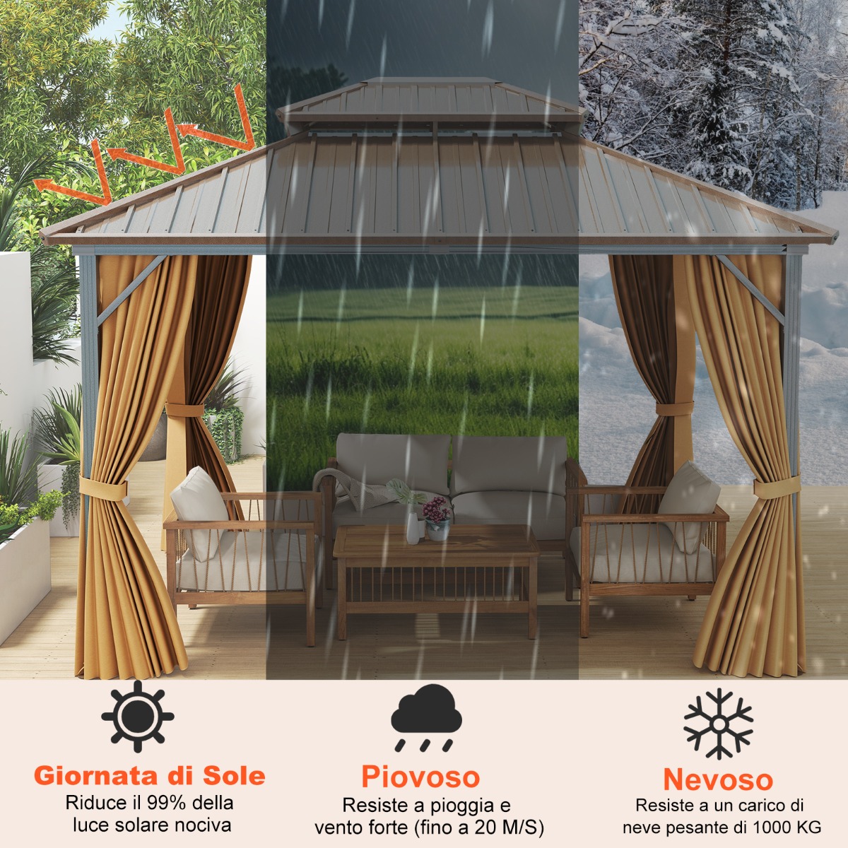 Migliora il Tuo Spazio Esterno! Il nostro gazebo hardtop 354 x 294 cm è dotato di un tetto in metallo zincato a doppio strato, che garantisce una buona ventilazione offrendo una protezione superiore dal sole, dalla pioggia, dal vento e dalla neve. Il tela
