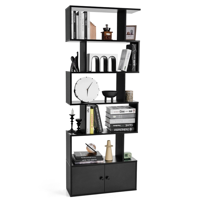 Costway Libreria a forma di S a 5 livelli con ante, Scaffali decorativi in legno per il soggiorno l’ufficio Nero