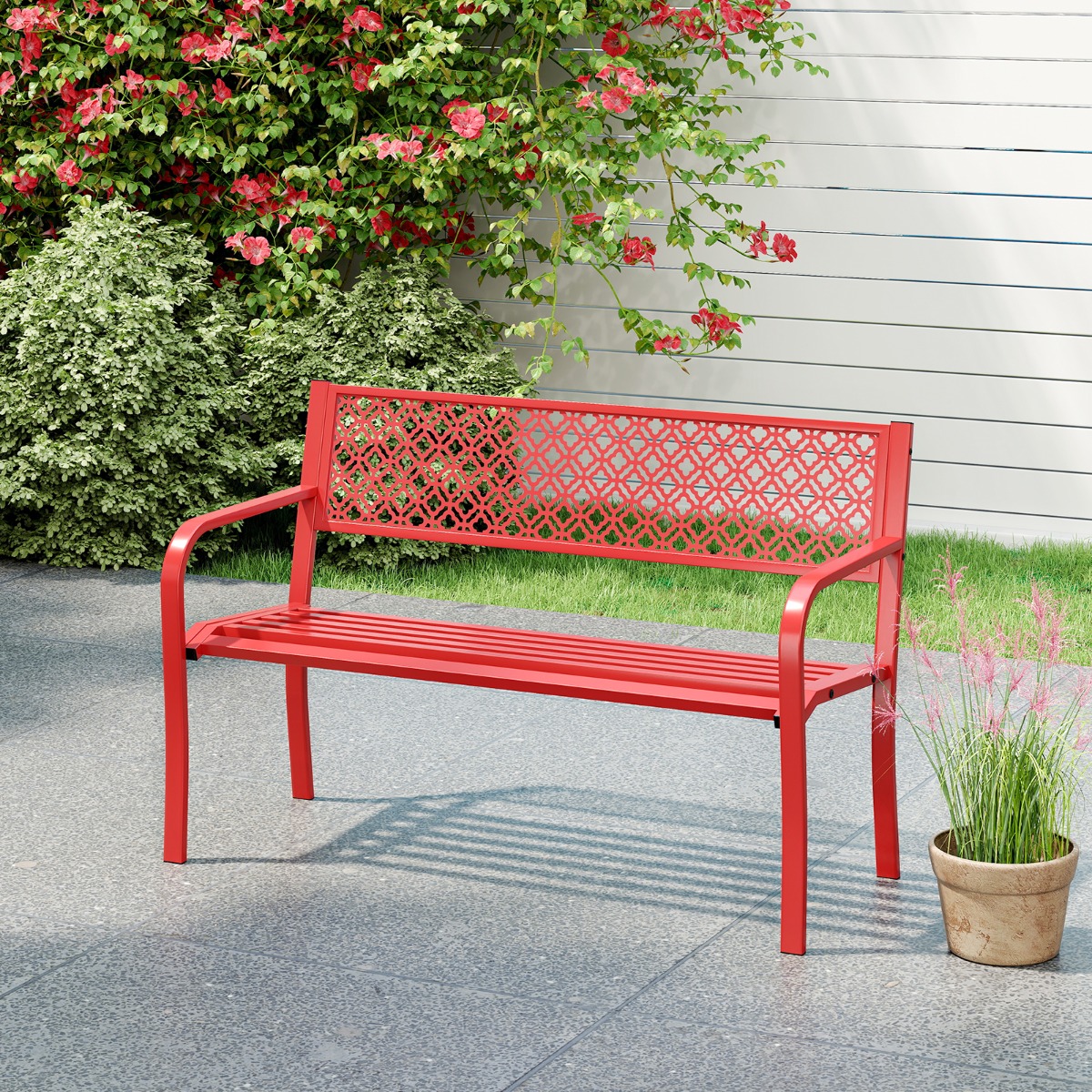 Costway Panca da giardino da 127 cm per esterni panca in metallo, Schienale motivo geometrico Rosso