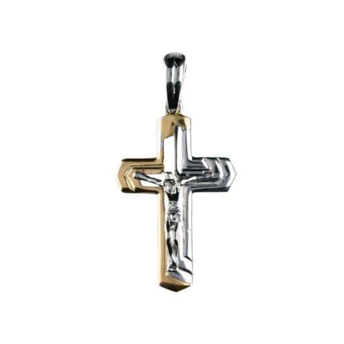 Ciondolo croce da uomo in oro giallo e bianco 750/00 (18kt), lavorazione lucida, dimensioni 3,70 x 2,00 cm, peso 3,10 grammi. Referenza: GL100049