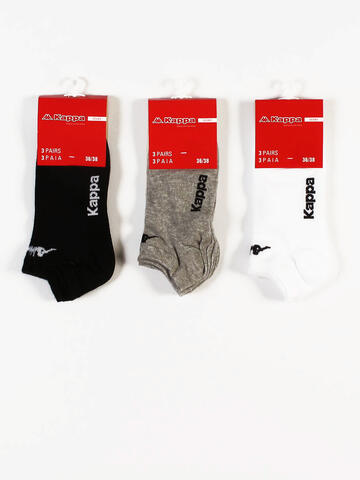 Calzini fantasmini sportivi da uomo e da donna di Kappa; art. K006.Confeziona da 3 paia.Disponibile nelle taglie 36-38, 39-41, 42-44 e 45-47 nei colori bianco, nero e grigio.