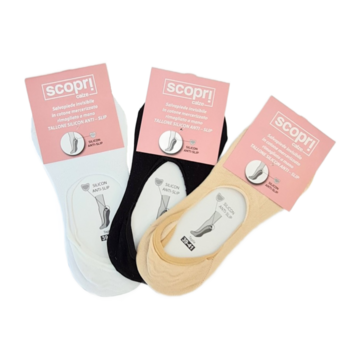 Calzino invisibile senza cuciture con silicone antiscivolo nel tallone.Cotone mercerizzato con rimaglio a mano.Taglia: S/M=35/38 - L/XL=39/41Colori Bianco, Nero e Corda