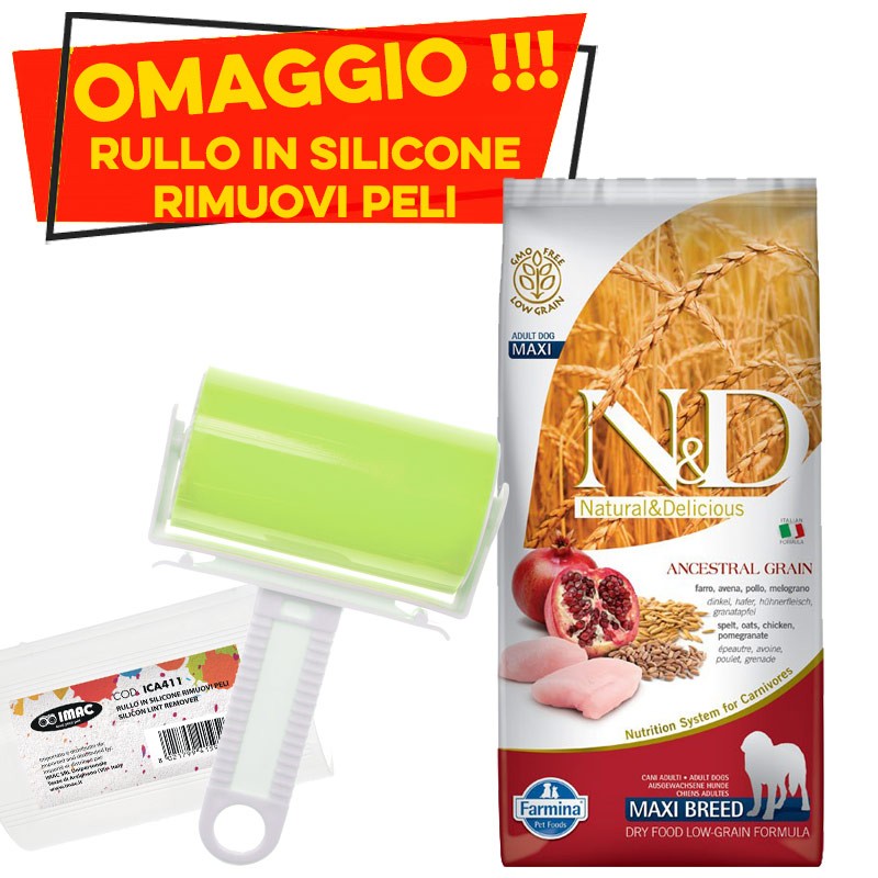 Farmina N&D Low Grain Adult Maxi Pollo e Melograno Peso Confezione 12 Kg + RULLO RIMUOVI PELI OMAGGIO!