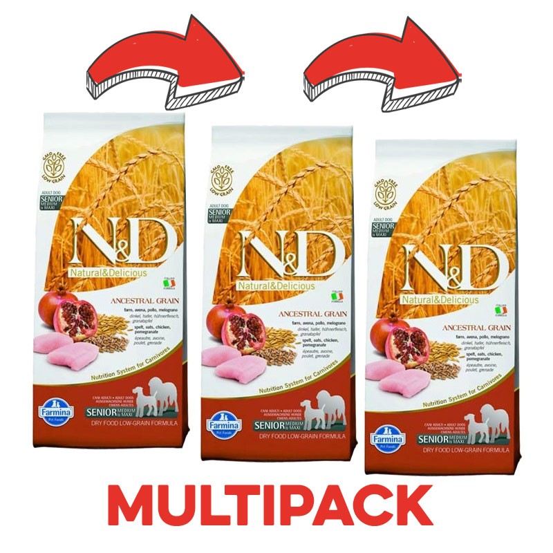 Chicken & Pomegranate Senior Medium & Maxi è un mangiare per cani anziani della linea Natural & Delicious Ancestral Grain canine, mangime secco per cani che si contraddistingue per la sua naturalezza. Farmina N&D Cane Senior Medium & Maxi Pollo e Melograno è un alimento completo per cani a basso indice glicemico poiché realizzato utilizzando rigorosamente cereali ancestrali. Poiché i cani in natura si nutrono principalmente di carne, la percentuale di carboidrati di questo cibo è intenzionalmente limitata: è composto per il 60% di ingredienti di origine animale rigorosamente selezionati, 20% di cereali ancestrali (di cui il 10% avena e il 10% farro), 20% di frutta e vegetali che completano la formulazione rendendola bilanciata dal punto di vista nutrizionale. Proprio grazie all’utilizzo di questi grani alternativi, le crocchette per cani contribuiscono a stabilizzare la glicemia aiutando a prevenire il diabete. Ingredienti naturali quali mirtilli, melagrana in polvere, mela, spinaci, ribes, arancia, rafforzano poi le difese e sostengono il funzionamento degli organi del cane apportando, al tempo stesso, importanti vitamine. Questo mangime per cani contiene antiossidanti naturali che consentono di conservare in maniera totalmente naturale il prodotto. N&d crocchette per cani low ancestral grain è confezionato in atmosfera protettiva per evitare l’ossidazione dei grassi e conservare il prodotto sempre fresco. Senza ingredienti geneticamente modificati, è estremamente appetibile e digeribile e dunque indicato anche per animali con sensibilità digestive e intolleranze o allergie alimentari.