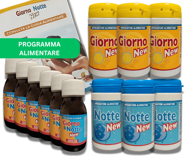 3 bottles of Giorno with 180 tablets, 3 bottles of Notte with 180 tablets, 6 bottles of diuretic, and an e-book on the Mediterranean diet with a 30-day guarantee.