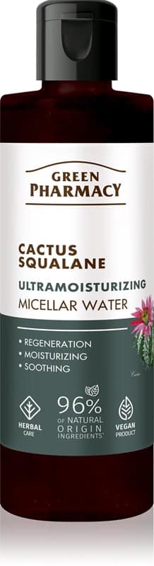 L’acqua micellare Green Pharmacy Cactus & Squalane Micellar Water è arricchita con minuscole particelle attive che legano tutte le impurità e il grasso a contatto con la pelle. Grazie a queste particelle, chiamate micelle, l’acqua garantisce una rimozione completa del make-up in pochi minuti e senza bisogno di pressione o sfregamento della pelle. Le micelle sono così efficaci che riescono a gestire anche il make-up resistente all’acqua.