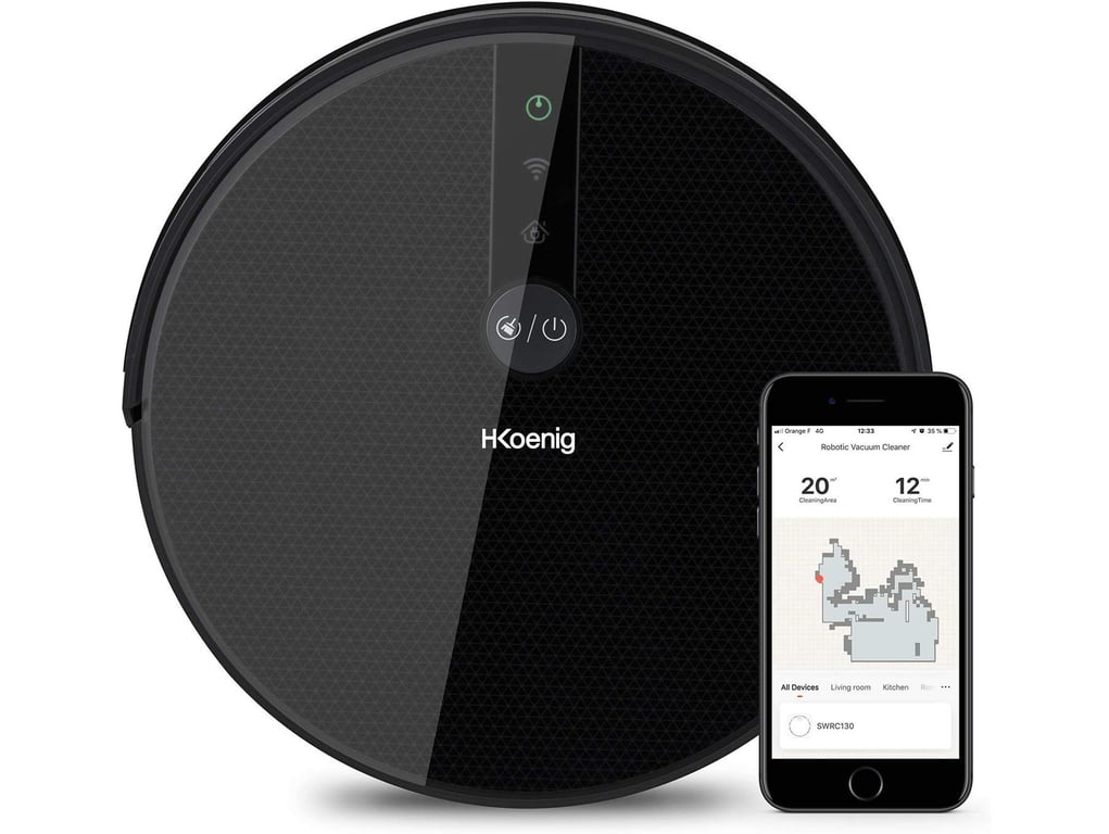 H.Koenig WaterMop Gyro+. Tipo di contenitore della polvere: Senza sacchetto, Colore del prodotto: Nero, Forma: Rotondo. Capacità polvere (totale): 0,6 L, Filtro dell’aria di aspirazione: HEPA, Tipo di spazzola: Spazzola a rullo e spazzola laterale. Tecnologia batteria: Litio, Capacità batteria: 2500 mAh, Autonomia: 120 min. Diametro: 33 cm, Altezza: 74 mm, Peso: 2,7 kg – Prodotto nuovo