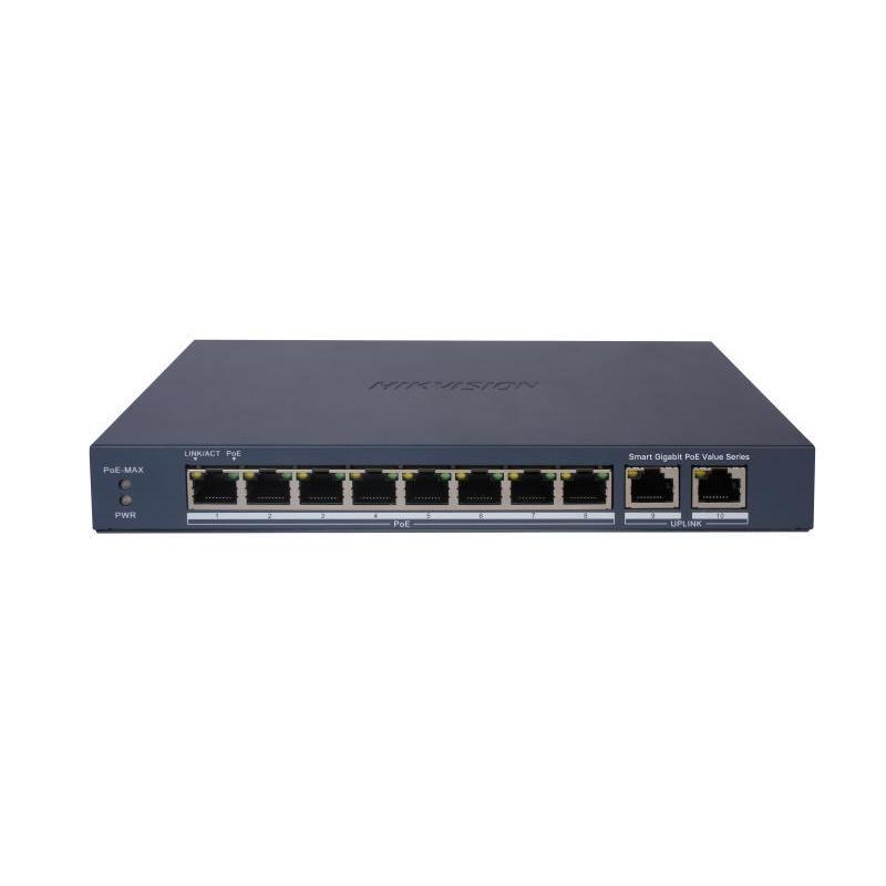 Hikvision switch l2, smart managed, 8 gigabit rj45 poe ports, 2 gigabit rj45 port, 802.3af/at, poe p