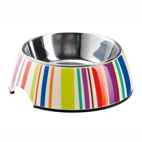 Ciotola a righe per cani e gatti, robusta e resistente ai graffi. Con cestello estraibile in acciaio inox lavabile in lavastoviglie e piedini in gomma sul fondo per garantirne una funzione antiscivolo.