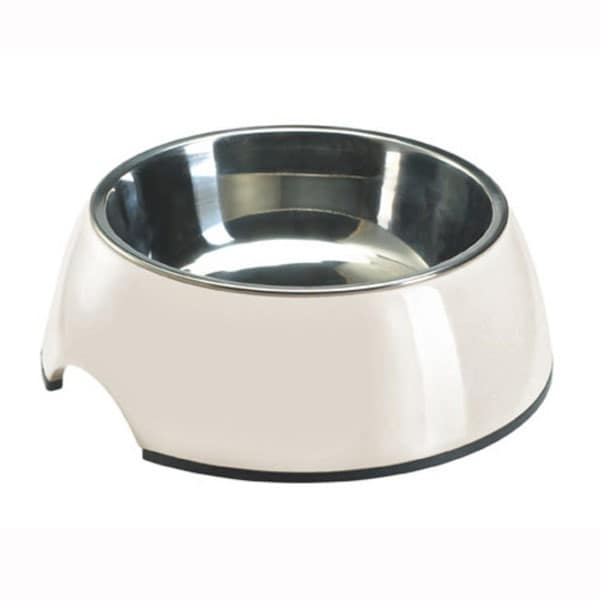 Ciotola bianca per cani e gatti, robusta e resistente ai graffi. Con cestello estraibile in acciaio inox lavabile in lavastoviglie e piedini in gomma sul fondo per garantirne una funzione antiscivolo.