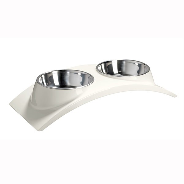 Doppia ciotola Elegance bianca per cani e gatti, robusta e resistente ai graffi. Con cestelli estraibili in acciaio inox lavabili in lavastoviglie e forma curvata.