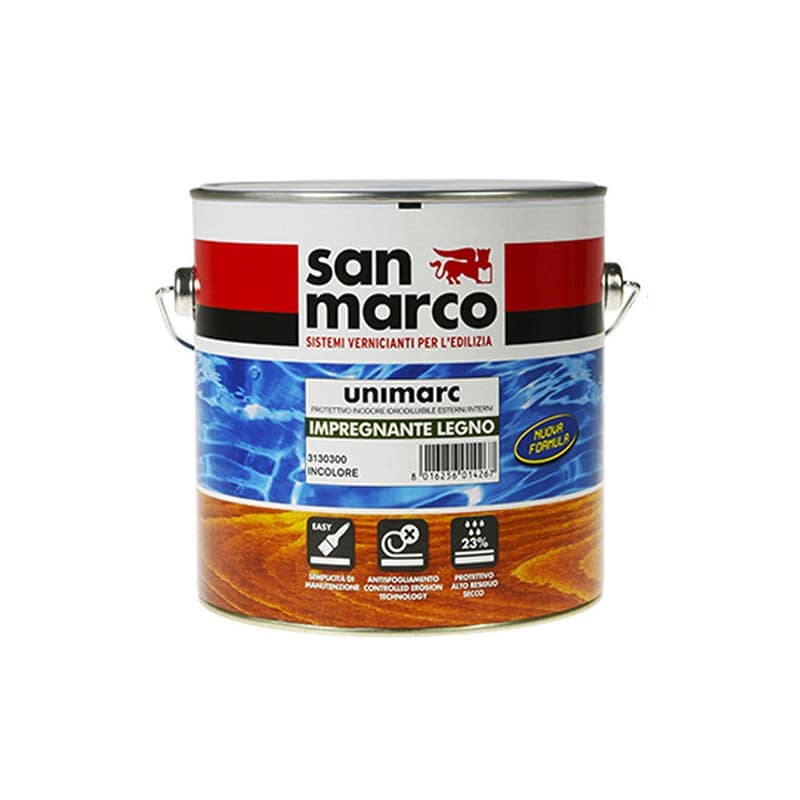 UNIMARC IMPREGNANTE LEGNO è un prodotto a base di resine acriliche/alchidiche all’acqua di nuova generazione, per l’impregnazione e la finitura del legno all’interno ed all’esterno. Residuo secco elevato, conferisce protezione ai raggi UV, alle intemperie ed ai cicli gelo/disgelo – L’innovativa formulazione permette un’erosione superficiale controllata nel tempo del prodotto, evitando sfogliamenti. Garantisce una facile manutenzione, anche a distanza di anni dalla sua applicazione non serve carteggiare per asportare il prodotto prima di sovraverniciare – Altamente traspirante, ravviva le tonalità lasciando visibili le venature originarie. Ottima elasticità, in grado di seguire naturali variazioni strutturali del legno – Attrezzi per Utilizzo pennello,spruzzo – Diluzione con acqua – Pronta all’uso – Resa 8-10 mq/l per strato – Strati 2 –