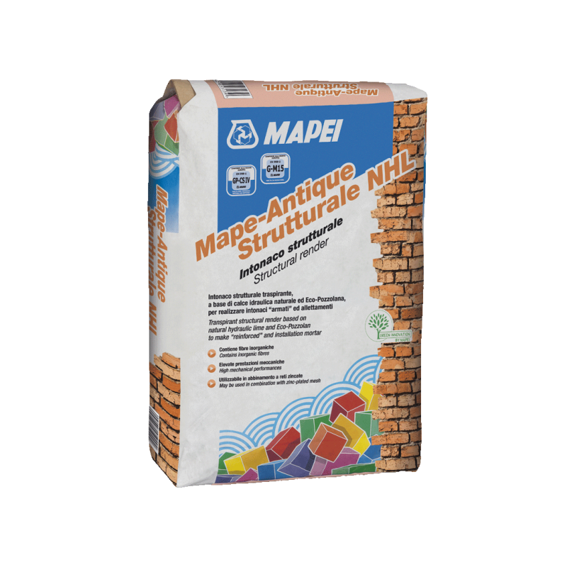 MAPE-ANTIQUE STRUTTURALE NHL è una malta per intonaci traspiranti e da muratura, ad elevate prestazioni meccaniche, a base di calce idraulica naturale, esente da cemento, particolarmente indicata per realizzare intonaci “armati” (CRM) ed allettamenti VANTAGGI: Elevate prestazioni Certificato Traspirante Ottima lavorabilità Elevata compatibilità Composizione Dimensione dell’aggregato 2,5 mm Rapporto dell’impasto 100 parti di Mape-Antique Strutturale Nhl con 16-17 parti di acqua Porosità della malta allo stato fresco 7% Coefficiente di permeabilità al vapore acqueo 60 µ Tempo di lavorabilità della malta fresca ca. 60 min. Spessore minimo applicabile 10 mm Spessore massimo applicabile per strato 40 mm Classificazione EN 998-1 malta tipo GP di categoria CS IV Classificazione EN 998-2 malta tipo G di classe M 15 Immagazzinaggio 12 mesi Applicazione intonacatrice a miscelazione continua o a cazzuola Consumo ca. 17 kg/m² (per cm di spessore) Confezioni sacchi da 25 Kg