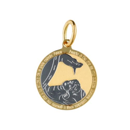 Ciondolo medaglia da battesimo in oro giallo e bianco 750/00 (18kt), fonte battesimale a rilievo, lavorazione lucida e satinata, diametro 1,50 cm, peso 1,80 grammi. Referenza: GL100024