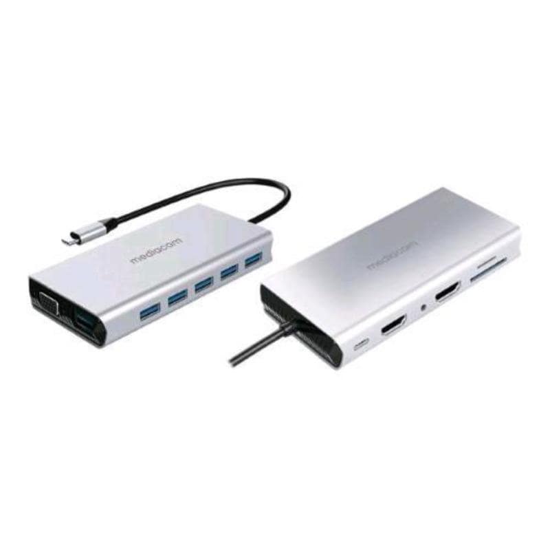 Mediacom md-c317 docking station usb-c 5 x usb-a 3.0 – 1 x usb-c power delivery 100 w – 1 x hdmi – 1 x rj-45 gigabit – 1 x jack 3.5mm audio -1 x vga d-sub hd 15 pin – 1 x sd – 1 x micro sd in aluminio