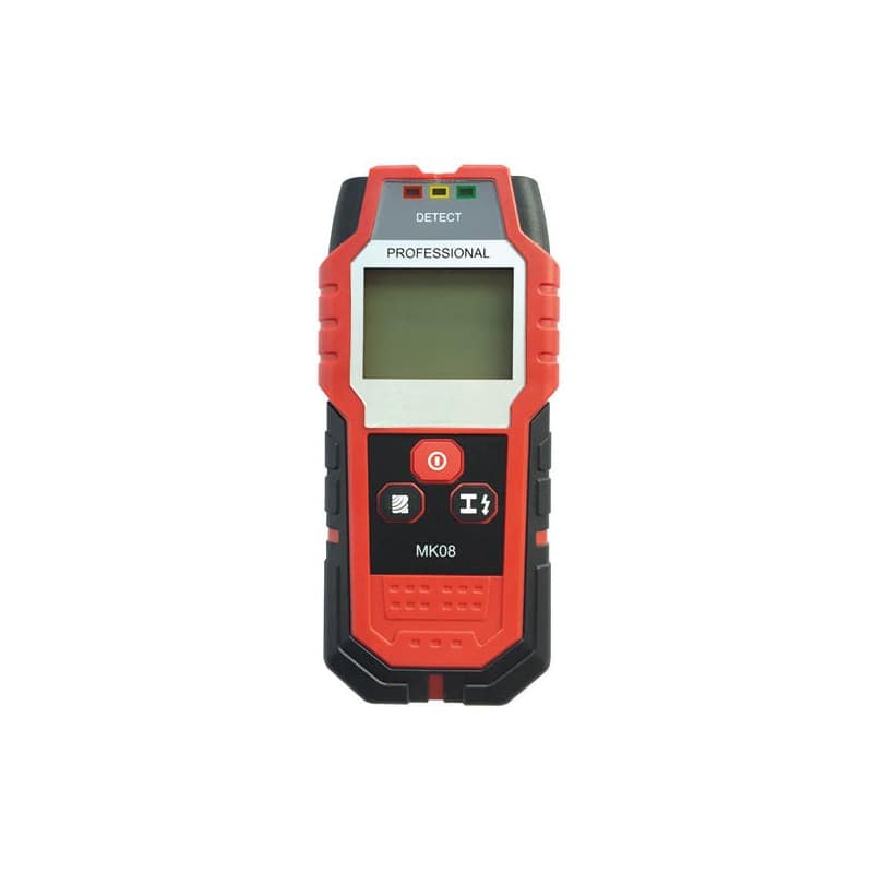 Rilevatore di metalli, ideale per la ricerca di tubazioni e cavi elettrici • indicazione sonora e visiva della zona in esame • discriminazione di metalli ferrosi e non ferrosi • controllo della sensibilità • display LCD • indicatore di batteria scarica. Metalli ferrosi 80 mm Metalli non ferrosi 60 mm Cavi elettrici sotto tensione 50 mm Legno 20 mm Spegnimento automatico 5 minuti Temperatura di esercizio -10°C/ + 50°C Autonomia 6 ore Dimensioni 200 x 80 x 20 mm Peso 240 gr
