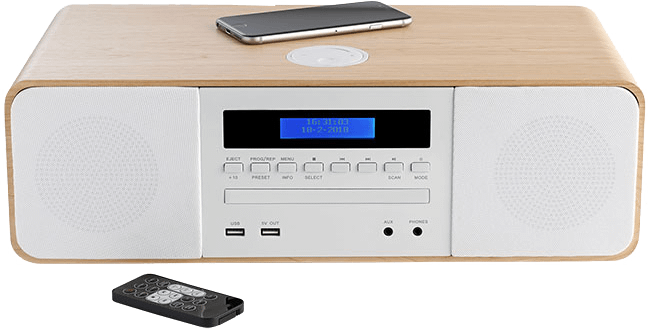 Bluetooth® Potenza musicale totale: 50 Watt Sintonizzatore FM digitale con ricerca automatica 20 stazioni radio memorizzabili AUX-IN Porta USB da 3,5 mm Riproduzione dei vostri MP3 Caricatore USB Equalizzatore Caricatore wireless: induzione Sveglia semplice: sveglia con il cicalino, FM, il vostro CD o con la musica da USB. Programmare un orario di sveglia tra 15, 30, 45 o 60 minuti Regolare il volume della sveglia Telecomando 1 x LR 03-AAA (non incluso) Alimentazione di rete 230V * Il telefono deve essere alimentato da caricatori wireless o compatibili con la tecnologia QiTechnology. – Prodotto nuovo