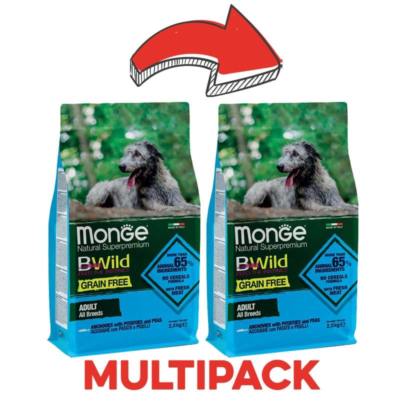 Monge BWild Grain Free Acciughe e Patate Adult per Cani Peso Confezione 2.5 Kg – KIT 2x